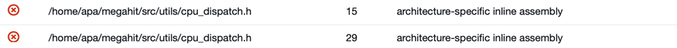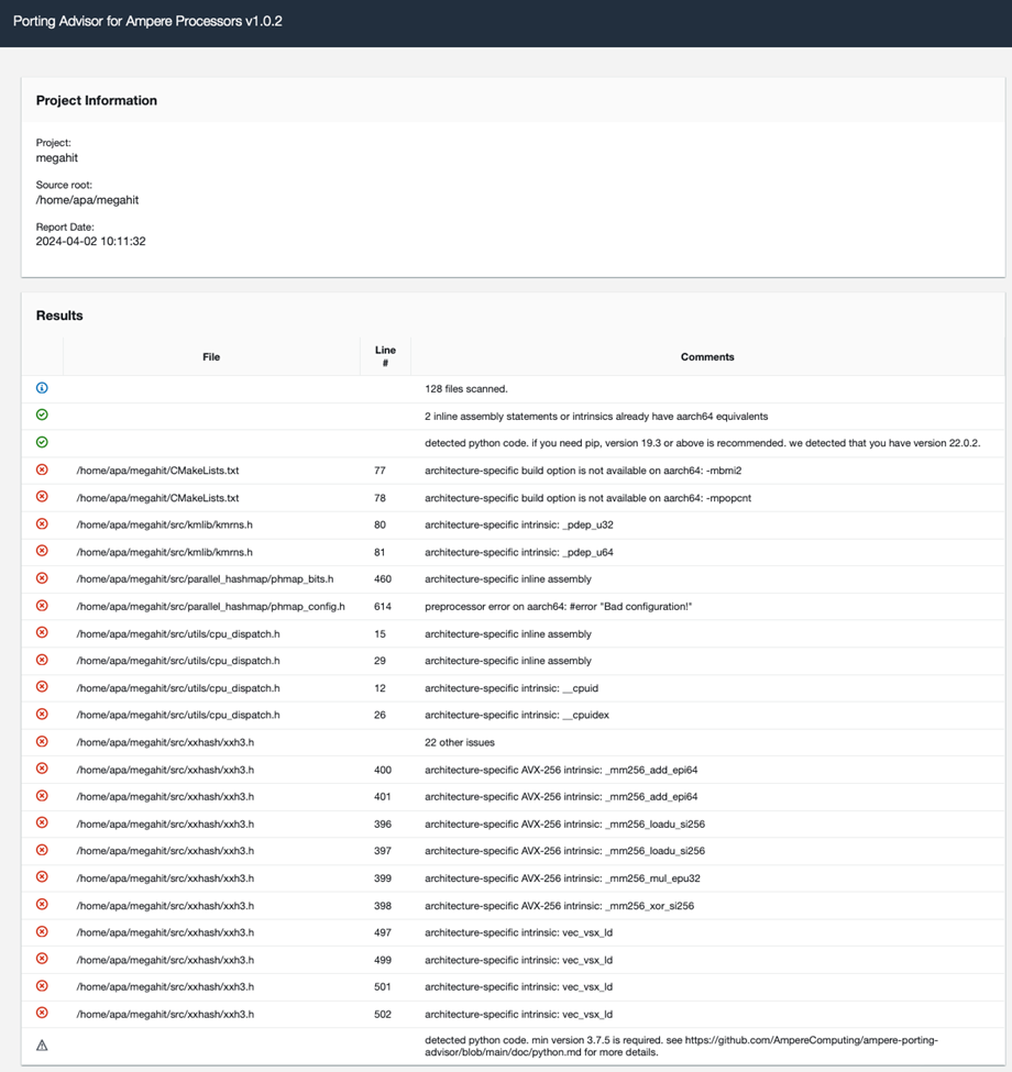 In this case, Ampere Porting Advisor (APA) can play a key role. After scanning the source repository of the MEGAHIT project with APA, we get a list of issues that need to be checked before rebuilding MEGAHIT on Arm64: