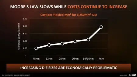 As the industry moves to smaller process nodes, costs for yielding large dies continues to increase. Compared to 250 mm² die on the 45 nm process, the 16 nm process more than doubles the cost/mm² and the 7 nm process nearly double that to 4x the cost per yielded mm². Moving to the 5 nm and even 3 nm nodes, the cost is expected to continue to increase. Fabricating large monolithic dies will becomes increasingly less economical. One solution to easing the economics of manufacturing chips with a large amount of transistors, the industry has started shifting to chiplet-based design whereby a single chip is broken down into multiple smaller chiplets.