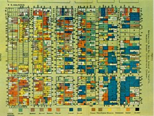 Hull House, a settlement house in Chicago, provided assistance to a poor, largely immigrant population. Middle class volunteers worked with low-income individuals and families, sharing social and cultural knowledge in the hope of alleviating poverty through behavioral intervention. Inspired by Booth’s mapping of London Poverty and social characteristics, social reformer Florence Kelley (funded by the U.S. Department of Labor) documented and mapped social conditions in Chicago, including nationality and wages in the early 20th century, and inspired similar data collection and mapping projects in other US cities. |