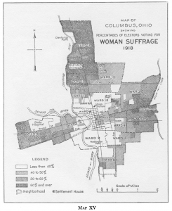 The first map below was the source for the Racial, National, and Industrial Localities map app at this site (here). The second map shows the homes of “delinquents” (under court supervision). The final pair of maps shows voting patterns in Columbus on prohibition and women’s suffrage. A visual comparison suggests that districts voting for women’s rights were also strongly supportive of prohibition.
