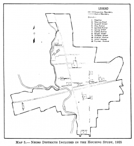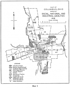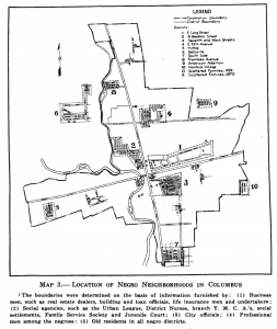 Sociologist Mary Louise Mark’s survey of African Americans in Columbus, published in 1928 contains a wealth of data on black neighborhoods in Columbus. Maps below show “negro neighborhoods” around the mid 1920s, and a 2nd map shows areas included in the housing study documented in Mark’s book.