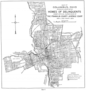 Also in Blanchard’s thesis are five manuscript maps. On each, Blanchard sketched out data he collected on areas of Columbus on a printed city road map. The maps are linked below, with a description of their content.