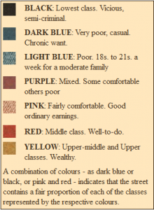The mapping of detailed social data on urban maps, propelled by moral and social reformers in the 19th century, is exemplified by the London maps of philanthropist Charles Booth. Booth’s detailed maps of poverty and wealth (legend to the right), with an accompanying series of books Life and Labour of the People (3rd edition in 17 volumes, 1902–03) played a significant role in initiating governmental anti-poverty programs, old age pensions and free school lunches in the early 20th century. | ![]() |