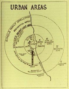 The Chicago School of Sociology, also known as Urban Sociology or Urban Ecology, produced scholars who studied the city and its spatial patterns, collecting large amounts of data and documenting their work with photographs and maps. Inspired by Booth’s work in London and the Kelley’s Hull House work in Chicago, the Chicago School sociologists set out collect and map social data within a scholarly, academic context. While accused of being more interested in empirical data than in theory, the Chicago School scholars were strongly influenced by evolutionary thinking (from the biological sciences), suggesting theories of urban development and form (such as the concentric zone model) that strongly influenced the academic study of urban spaces, development, and social geography.