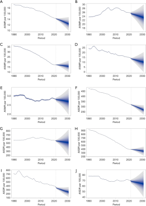 BAPC model projections of ASMR and ASDR for TBL attributable to tobacco, 2022–2031
