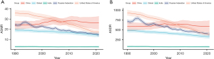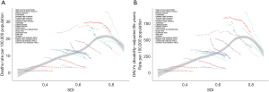 Between 1990 and 2021, the SDI had a significant association with ASMR and ASDR for TBL caused by tobacco in 21 countries and regions around the world (Figure 4). When SDI <0.76, ASMR and ASDR gradually increased with increasing SDI. When SDI ≥0.76, ASMR and ASDR significantly decreased. We found that ASMR and ASDR were higher than predicted in high-income North America, Central Europe, Western Europe, East Asia, and Oceania. As SDI levels increased, ASMR and ASDR decreased more pronouncedly.