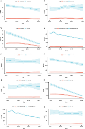 In both 1990 and 2021, the ASMR and ASDR for tobacco-attributable TBL were consistently higher in males than in females, both globally and in China, the USA, the Russian Federation, and India. Almost all male patients had greater absolute EAPC values than females (Indian male patients had smaller absolute EAPC values for ASMR and ASDR than female patients). Although the burden of disease for female patients is much smaller than that for male patients, the rise in the burden of disease for female patients is greater than that for male patients, except in India, where the opposite is true.