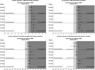 We included a total of 161 articles describing 151 trials (n = 6306). LVRT was the most effective for improving timed up and go [− 1.20 standardised mean difference (SMD), 95% confidence interval (95% CI): − 1.57 to − 0.82], 6-min walk test (1.03 SMD, 95% CI: 0.33–1.73), lean body mass (0.25 SMD, 95% CI: 0.10–0.40) and muscle hypertrophy (0.40 SMD, 95% CI: 0.25–0.54). Both MVRT and HVRT were the most effective for improving lower-limb strength, while only HVRT was effective in increasing fast walking speed (0.40 SMD, 95% CI: − 0.57 to 0.14). Regarding the moderators, our results were independent of program duration and mainly observed for healthy older adults, while evidence was limited for those who were physically impaired.