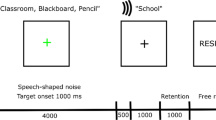 The relatively long retention periods (3–8 s) in the current study were chosen to ensure a large enough dynamic range to manipulate the SOAs in the irregular condition. For example, in Experiment 3, given that the duration of speech stimuli was 350 ms, we manipulated the temporal structure by constraining the SOAs to be within the 400–1100 ms range with a mean of 750 ms, the SOA employed in the temporally regular condition. As a result, the distractor sequence was relatively long (~ 5.6 s) and a long retention period was employed. Differential distraction by speech of varying acoustic detail was also found in a previous study with a retention period longer than the one used in the current study29. As the main research interest in the current study was to unravel the difference between temporally regular and irregular distractors, we compared the outcome measures between temporally regular and irregular conditions, holding the retention period constant between conditions within each experiment.