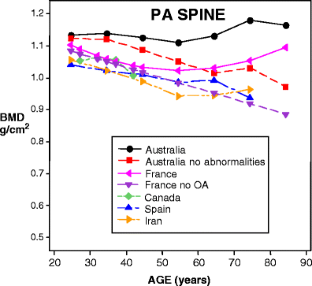 Diaz Curiel M, Carrasco de la Pena J, Honorato Perez J, Perez Cano R, Rapado A, Ruiz Martinez I (1997) Study of bone mineral density in lumbar spine and femoral neck in a Spanish population. Osteoporosis Int 7:59–64