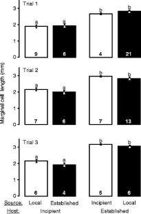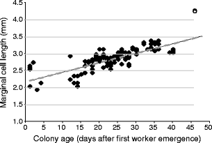 The body size of emerging bees is positively correlated with colony age. Similar to the analysis presented in Fig. 1, but for bees emerging in a different colony. Each filled circle represents a worker (n = 56); each open triangle represents a drone (n = 46). Day 1 is the day of first worker emergence. There is a positive correlation between adult body size and colony age: workers—R 2 = 0.52, p < 0.001; drones—R 2 = 0.69, p < 0.001. (PDF 44 kb)