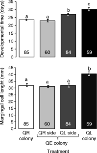 Signals from the queen shortens larval developmental time. Colonies were split into two similar parts using plastic meshes. The colonies in the upper row were separated by a mesh that enabled workers but not the queen to move between the two compartments (“Queen excluder colonies”). The colonies in the middle row were separated by a mesh that enabled both workers and the queen to move freely between the two compartments (“Queenright colonies”). The colonies in the bottom row have a mesh allowing free worker movement but did not have a queen (“Queenless colonies”). Gray bars—the side of the hive in which sugar syrup was provided (“S”); open bars—the side of the hive in which pollen was provided (“P”). In the queen excluder colonies, gray is also the queenless side (QL) and the open bars are the queenright side (QL). Values are mean ± SE; sample size is given inside the bars. Body size (left column) and developmental time (right column) were compared between the two sides in each colony; p values were obtained using Student’s t tests (N.S. not significant). (PDF 153 kb)