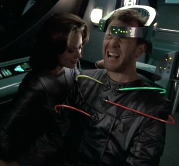 On the shuttle, Alice urges Paris to complete the interface to disrupt a tractor beam Voyager has locked on the shuttle. Different colored wires coil around him, plugging into the attachments on his flight suit. Now one with the shuttle, he disrupts the tractor beam with an optronic pulse, fires on the ship and goes to warp, disappearing from Voyager's sensors.