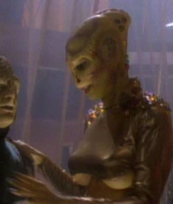 This alien, which bore bluish skin and facial bone plates, was among the residents of Deep Space 9 at the beginning of its Bajoran administration. She visited Quark's when it reopened after Commander Sisko and Quark made an agreement.