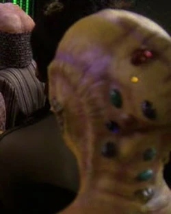 This alien, with tendrils protruding the top of his head with a bony jaw and brow line and facial spines, visited Deep Space 9 in 2374.
