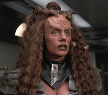 She and the other Klingons were transported onto USS Voyager when their ship developed "engine problems." While on board, she at first wished to mate with Harry Kim when he pulled her back during a fight with another Klingon, but later became sexually aroused by Neelix when he seemed to dominate Kim. They had a torrid affair, much to the frustration of Tuvok, who was sharing quarters with Neelix at the time. She and the other Klingons settled on a new planet soon after. (VOY: "Prophecy")