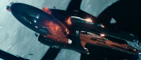 The two starships, both critically damaged, were caught by Earth's gravity and began falling toward the surface. Kirk managed to reactivate the Enterprise's warp core in time to avert a crash, but suffered fatal radiation poisoning in the process. Believing his crew to be dead, Khan directed the Vengeance to crash into Starfleet Headquarters in a final act of spite. The enormous ship plowed through San Francisco, obliterating landmarks like Alcatraz Penitentiary and killing many civilians before coming to a rest.