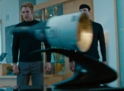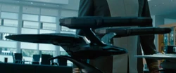 In 2259 of the alternate reality, Admiral Marcus kept fourteen air and spacecraft models in his office. These models included the Wright Flyer, Spirit of St. Louis, a V-2 rocket, an X-15 rocket plane, the Vostok 1 spacecraft, a Gemini capsule, Enterprise (OV-101), an Ares V rocket, the USS Enterprise ring ship, the Phoenix, the NX-Alpha, Enterprise NX-01, the USS Kelvin, and the USS Vengeance. (Star Trek Into Darkness)