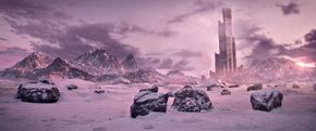 In the 2370s, a view of the surface of Rigel VII was depicted on several viewscreens on Deep Space 9's Promenade and Replimat, advertising a visit to the "spectacular castles of Rigel VII". (DS9: "Whispers", "The Muse", "What You Leave Behind")