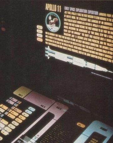 Information about Apollo 11, including the Saturn V rocket, was on display in the USS Enterprise-E's library during its mission in the Briar Patch in 2375. (Star Trek: Insurrection magazine "Novel Graphics")