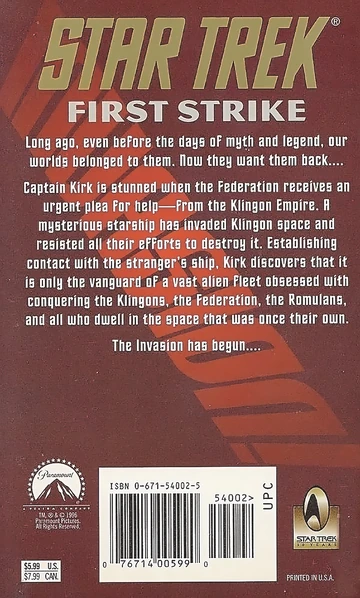 The beginning of the ultimate Star Trek saga! Book one of four. Across time and space, comes a Fury...—First Strike is a Star Trek: The Original Series novel by Diane Carey, published in July 1996. This was the first part of the Invasion! crossover, the 79th book in the Pocket Books series of numbered TOS novels.