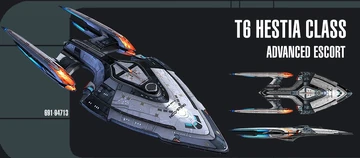 The Hestia class was a 25th century Federation starship class, an advanced escort and variant subclass of the 24th century Prometheus-class escort, in Starfleet service from the 2410s decade. (STO website: The Iconian War: Hestia Advanced Escort Stats)
