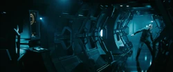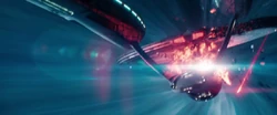 Marcus arrives in a secret Federation warship and demands Kirk turn Khan over for execution. Kirk heads to Earth at warp but the faster ship fires on and cripples the Enterprise in Earth's solar system, killing several crew members. Carol alerts Marcus to the fact she is onboard in the hope she will spare the crew but he simply beams her off.