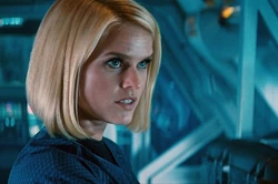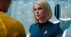 Scotty discovers a transwarp beaming device in the wreckage and learns Harrison beamed to a deserted part of Qo'nos. Marcus puts Kirk and Spock back in charge of the Enterprise and assigns them to use a new torpedo to destroy Harrison from a distance. Scotty refuses to take receipt of the torpedoes without proper schematics and he and Keenser resign, leaving Chekov as chief engineer. Lieutenant Carol Wallace signs aboard the Enterprise as a science officer but Spock quickly deduces she is actually Carol Marcus, the admiral's daughter.