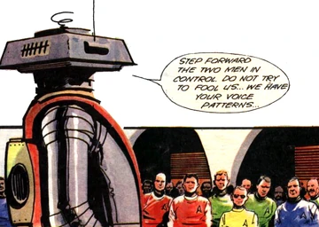 The arm announces itself as the Master Computer, and claims to be the creation of a race of Humans who left the robots on the planet a million years ago. While Kirk and Spock discuss the improbability of Humans from Earth being responsible for the creation of the robots the Master Computer goes on to explain the robots' predicament; their power source is dying, and they are attempting to find a replacement by dismantling the Enterprise. Having informed the crew of its planes the master computer seems ready to dispose of them, when Spock has a realisation; if the robot was constructed by men it would be programmed to respond to their commands. He tests his hypothesis by ordering the computer to put the crew down, it complies. Kirk postulates that the same tactic might work for the robots, and they are soon able to test the extension of the theory when two robots appear - they do not surrender as ordered; as next generation robots, they were built by other robots, and respond only to the commands of robots, not humans or the Master Computer. The Master Computer still responds though, and Spock orders it to restrain the robots. However, the robots threaten the life of the rest of the crew if they are not released, so Kirk is forced to comply.