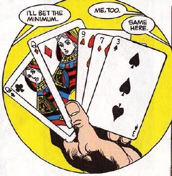 Poker was a card game of chance and skill which originated on Earth. The main aim of the game was for players to wager on the strength of their cards, in relation to the cards held by the other players. If a player believed they held a greater "hand" than another player, they could "call" them on it.