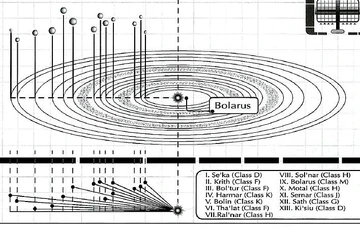 | Bolarus system | I. Se'ka • II. Krith • III. Bol'tur • First Bolarus asteroid belt • IV. Harmar • V. Bolin • VI. Tha'lat • VII. Ral'nar • Second Bolarus asteroid belt • VIII. Sol'nar • IX. Bolarus IX • X. Motal • XI. Sernar • XII. Sath • XIII. Ki'siu | |||||||||||||||||||||||||||||||||||||||||||||