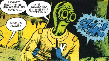 He sneaked up on Lubo, a guard in the mine, but a loose pebble exposed him, and they fought for control of Lubo's phaser rifle. Guard Glynko aimed his phaser at Tulb but accidentally disintegrated Lubo. Tulb was forced to return fire and kill Glynko, as the phaser rifle was locked on the kill setting. When guard Ubo fled, Kirk ordered Tulb to shoot him to prevent him from alerting other guards. But Tulb was unwilling to shoot the retreating Husian in the back. He used the phaser rifle to free prisoners until its power cell was drained.