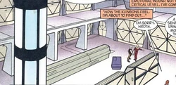 - The Enterprise-A arrives back at Earth, where Captain Kirk intends to surrender to Federation custody in order to prevent further bloodshed, due to escalating tensions between the Nasgulians and the Klingon Empire. He beams down to Starfleet Headquarters alongside Dr. McCoy and Commander Chekov, only to discover a waiting contingent of Klingon and Nasgulian delegates, led by Ambassador Kamarag and The Salla, as well as President Hiram Roth. Exchanging fierce insults, each party adjourns; the Klingons, in order to notify Emperor Kahless IV of what has transpired. In orbit aboard the Enterprise, Commander Uhura forms a bond with Protocol Officer Blaise in the officer's lounge, and the pair decide to beam down together for shore leave. In the now-empty Federation Council Chambers, Ambassador Sarek attempts to meditate, but is interrupted by Spock, and the two have a conversation concerning the foreign concept of "friendship," from a Vulcan point of view. In addition, Sarek announces his intention to speak out in Captain Kirk's defense at the upcoming trial. Kirk and his group meet with their legal counsel — the legal team of "Cogley and Cogley" (i.e., the now-married Samuel T. Cogley and Areel Shaw-Cogley). Elsewhere on Earth, the various Enterprise-A senior crewmembers take their leave -- Uhura and Blaise swimming in East Africa; Captain Scott in Glasgow, Scotland, where he visits the graves of his now-deceased nephew Peter Preston and his wife. Back at Federation Headquarters, Kirk reviews the impending legal charges with Samuel Cogley — the murder charges demanded by the Klingon Ambassador during the Whalesong crisis are being reinstated, as well as accusations of various Prime Directive violations. Steeling his will, Captain Kirk strides into the Federation Council Chambers to face his accusers... (TOS comic: "The First Thing We Do...")