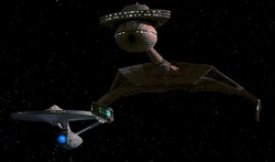 - Upon the death of the Romulan Praetor, the Enterprise-A delivers a complement of Federation archaeologists and musicians to a peace conference on Temaris Four, located within the Neutral Zone — a summit soon subjected to sabotage and murder by hardline elements within the Romulan delegation. However, the Cetacean Probe suddenly reappears in local space, and destroys a Romulan colony world and a number of vessels. The Enterprise and a Romulan Bird-of-Prey are captured by the Probe and whisked to the far side of the galaxy, where they discover the Probe's homeworld (later revealed to have been destroyed by the Borg). Contact is made with the Probe by Spock, and meaningful communication finally established between the entity and the Federation. (TOS novel: Probe)
