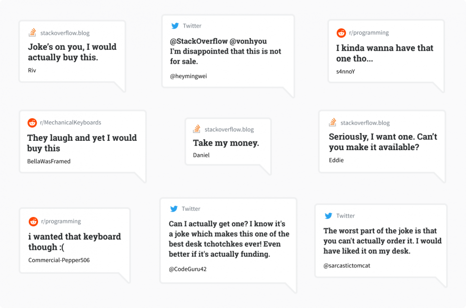 Cassidy connected us with Drop, a startup specializing in custom keyboards. They took her design from prototype to finished product. They also had the infrastructure in place to handle sales and logistics. “Our customer base has a lot of overlap with Stack Overflow. The Venn diagram of people who love coding and mechanical keyboards is pretty much a circle,” said Steve El-Hage, Founder and CEO of Drop.com. “We are excited to partner with an iconic brand and offer a tool that boosts productivity and puts a smile on people’s faces.”