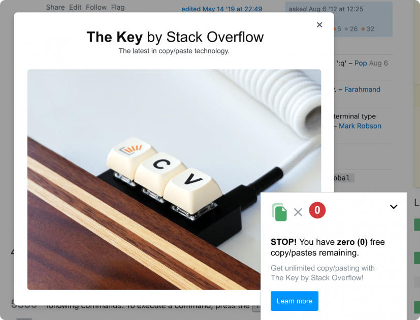 Every time someone entered the keyboard command to copy characters from Stack Overflow, we showed them a pop-up warning them they were almost out of free copies.