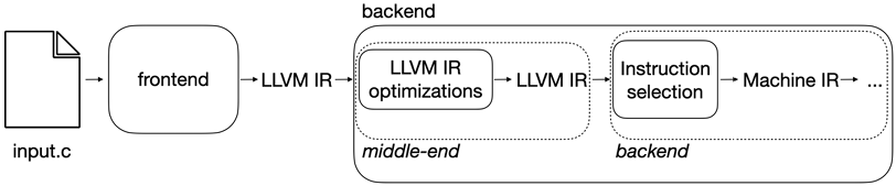 Figure 11.1: The compilation pipeline and the related IRsFigure 11.1 shows the input file (input.c) going through the frontend and being converted into the LLVM IR. Then, the backend takes over and starts by performing a sequence of LLVM IR to LLVM IR transformations. This sequence is, as you know, called the middle-end. Next, the backend runs the instruction selection pass, which translates the LLVM IR into Machine IR. This marks the beginning of the backend part of the backend (confusing, we know!). From this point forward, all the remaining passes...