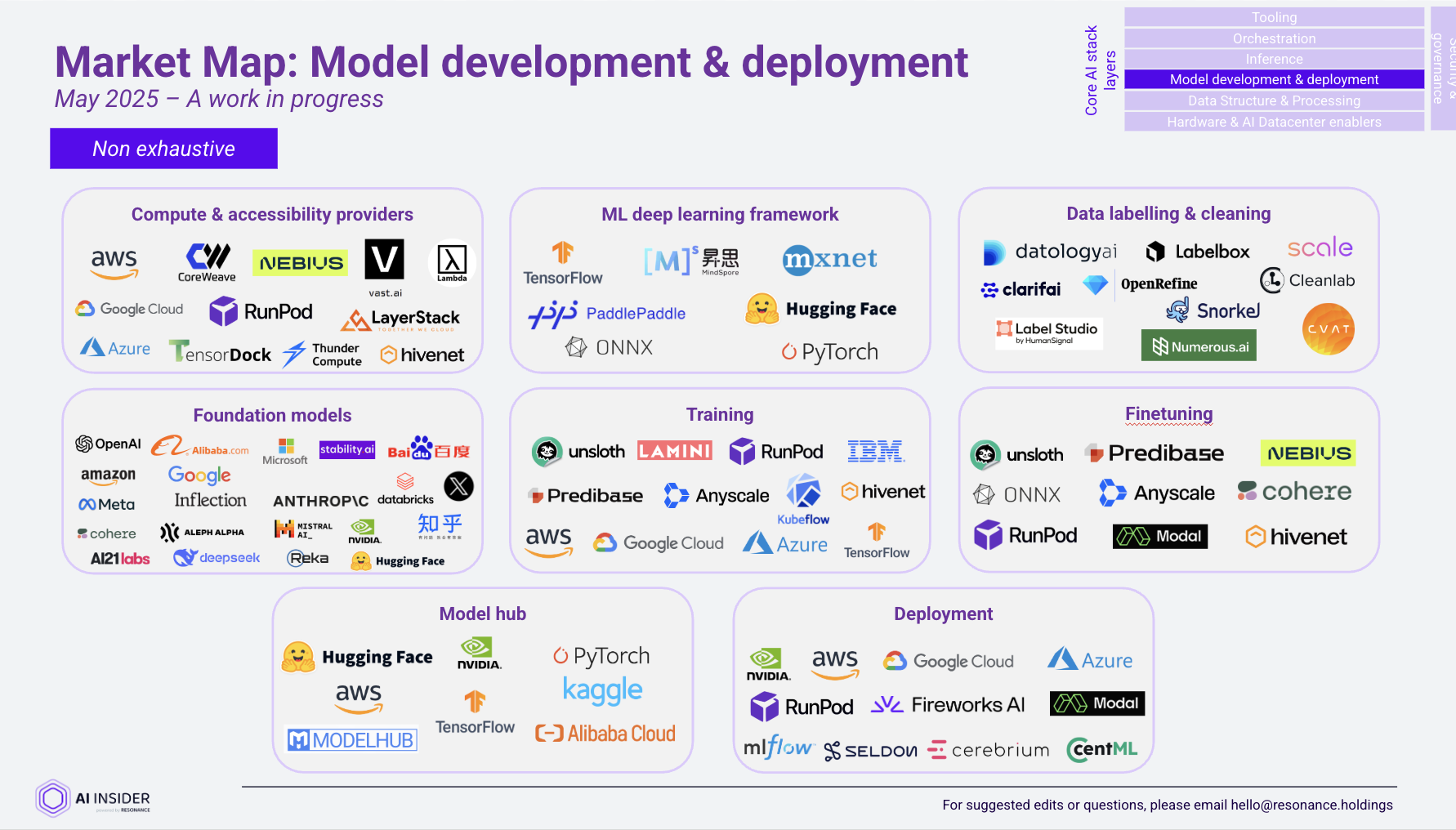 AI Insider’s Market Map: Model Development & Deployment lays out this lifecycle step by step — from provisioning infrastructure to packaging outputs — highlighting both the tools and the companies powering each phase.