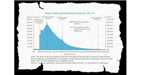 A graph prepared for the Abbott government’s tax white paper shows that bunching does indeed happen, but it is confined to only a narrow sliver of the income distribution and thus very few taxpayers. It’s probably not worth worrying about.
