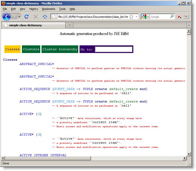 We'll stop this brief review here but you may continue browsing through the HTML pages if you like. Note how closely the appearance of the class texts, flat forms, contract forms, diagrams and other forms of documentation matches the corresponding formats under EiffelStudio.