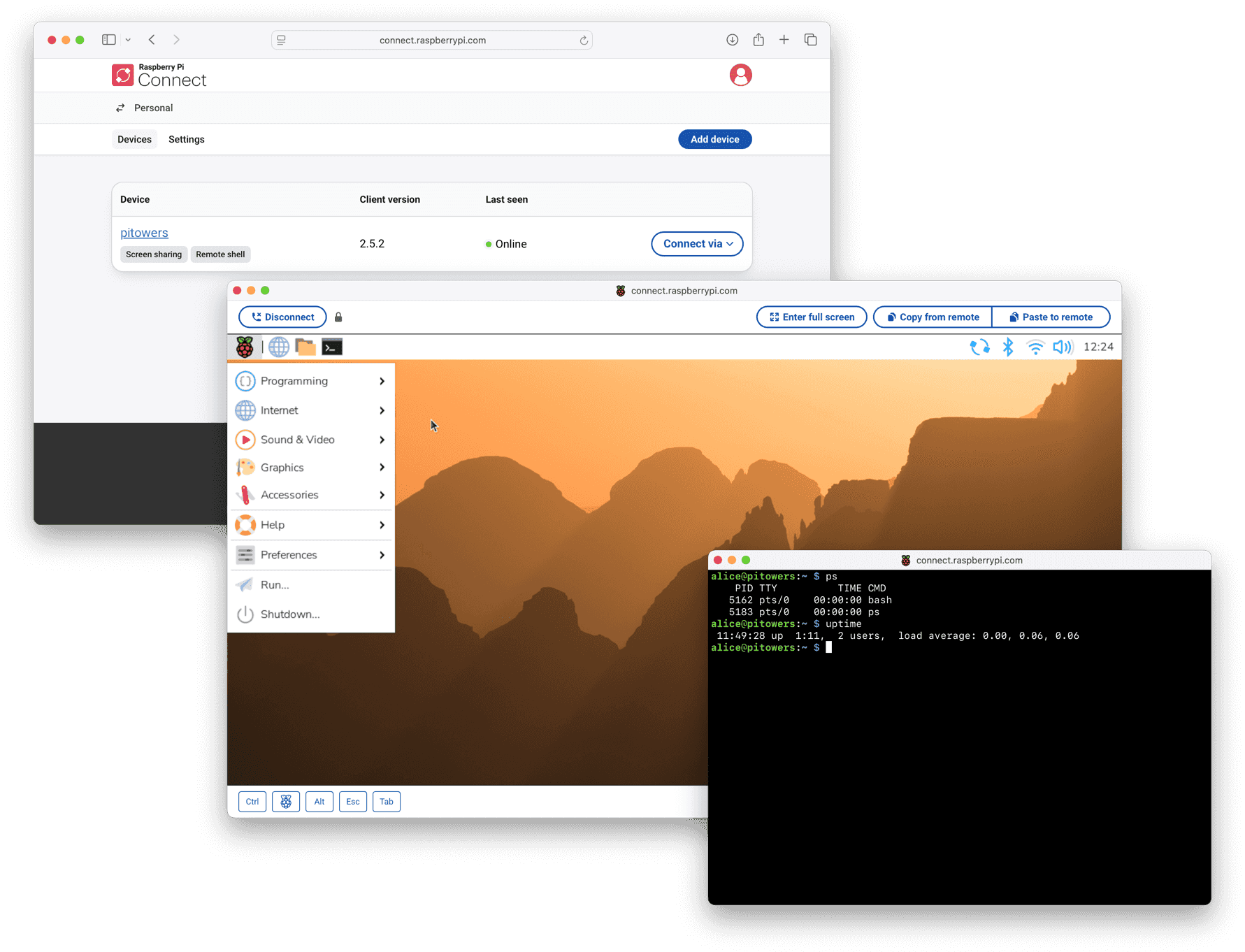 Raspberry Pi Connect gives you free, simple, out-of-the-box access to your Raspberry Pi from anywhere in the world. It is a secure remote access solution for Raspberry Pi OS, allowing you to connect to your Raspberry Pi desktop and command line directly from any browser.