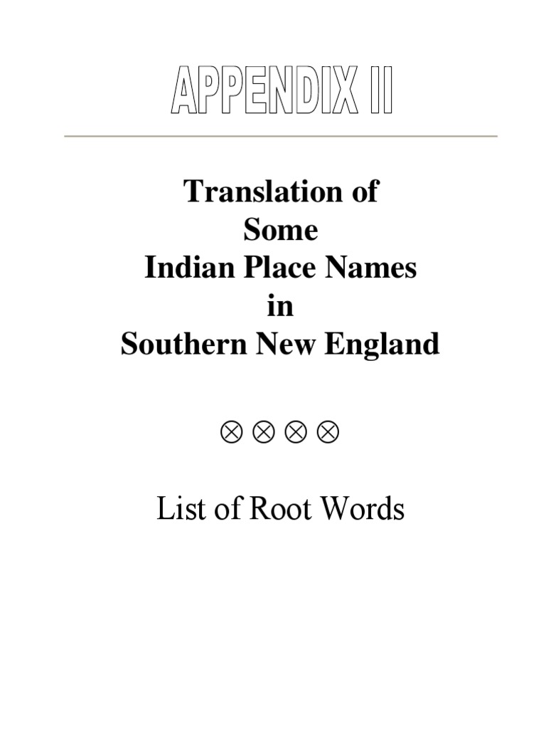 The following abridged topical list of common roots and combining elements from the Massachusett, Narragansett and similar languages can be used as a quick reference in deciphering some of the Indian place names in the book. The first column gives roots &c in the original Indian language, the second shows alternative corrupted spellings seen in the actual names, and lastly, the essential meaning of the Algonquian as seen in place names. Keep in mind that sometimes the root or combining element in an Indian place name is not much corrupted. Several variant source spellings are given to assist in identification of degenerated roots which, through the corruption process, have become difficult to discriminate in modern Indian names. This observation applies to listings of the same corrupted spellings associated with different roots (especially for those roots relating to descriptions of division, separation, opening, clearing, widening, narrowing &c). Be sure to remember the common connective vowel-consonant and syllabic glides, and reduced vowels, which often separate roots and combining elements—