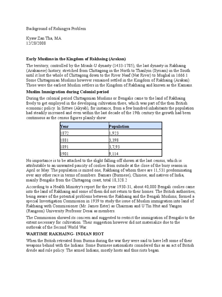 According to a Health Ministry's report for the year 1930-31, about 40,000 Bengali coolies came into the land of Rakhaing and some of them did not return to their homes. The British authorities, being aware of the potential problems between the Rakhaing and the Bengali Muslims, formed a special Investigation Commission in 1939 to study the issue of Muslim immigration into land of Rakhaing with Commissioner (Mr. James Ester) as Chairman and U Tin Htut and Yangon (Rangoon) University Professor Desai as members. The Commission showed its concern and suggested to restrict the immigration of Bengalis to the extent necessary for cultivation. Their suggestion however did not materialize due to the outbreak of the Second World War.
