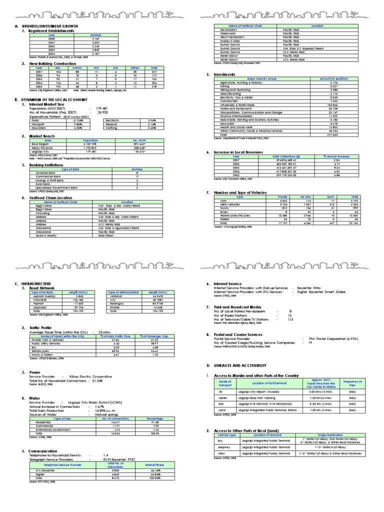 This document summarizes economic indicators and growth trends in Legazpi City, Philippines from 2004-2007. It outlines the increase in registered establishments like fast food chains and new buildings constructed each year. Major investments are listed by industry, with the largest in wholesale/retail trade. The local population and household statistics are provided to represent the internal market size. Banking institutions operating in the area are identified, and local revenue collections and vehicle ownership numbers are trended over this period.