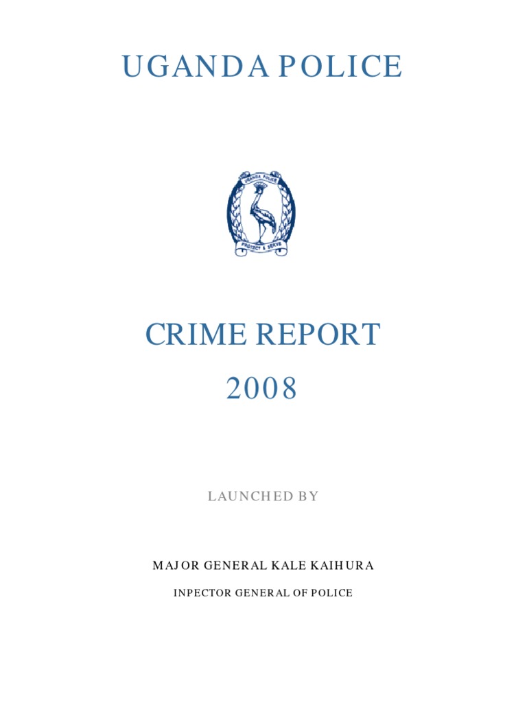 The Uganda Police Force Crime Report for 2008 was launched by the Inspector General of Police, Major General Kale Kaihura. The report provides crime statistics for Uganda in 2008, including crime rates by district and category of crime. It finds that the districts with the highest crime rates were Kampala, Wakiso and Mukono. The most common categories of crime were homicides, robberies, thefts, and economic crimes. The report also analyzes Criminal Investigations Directorate performance and provides recommendations on addressing challenges like increasing crime rates.