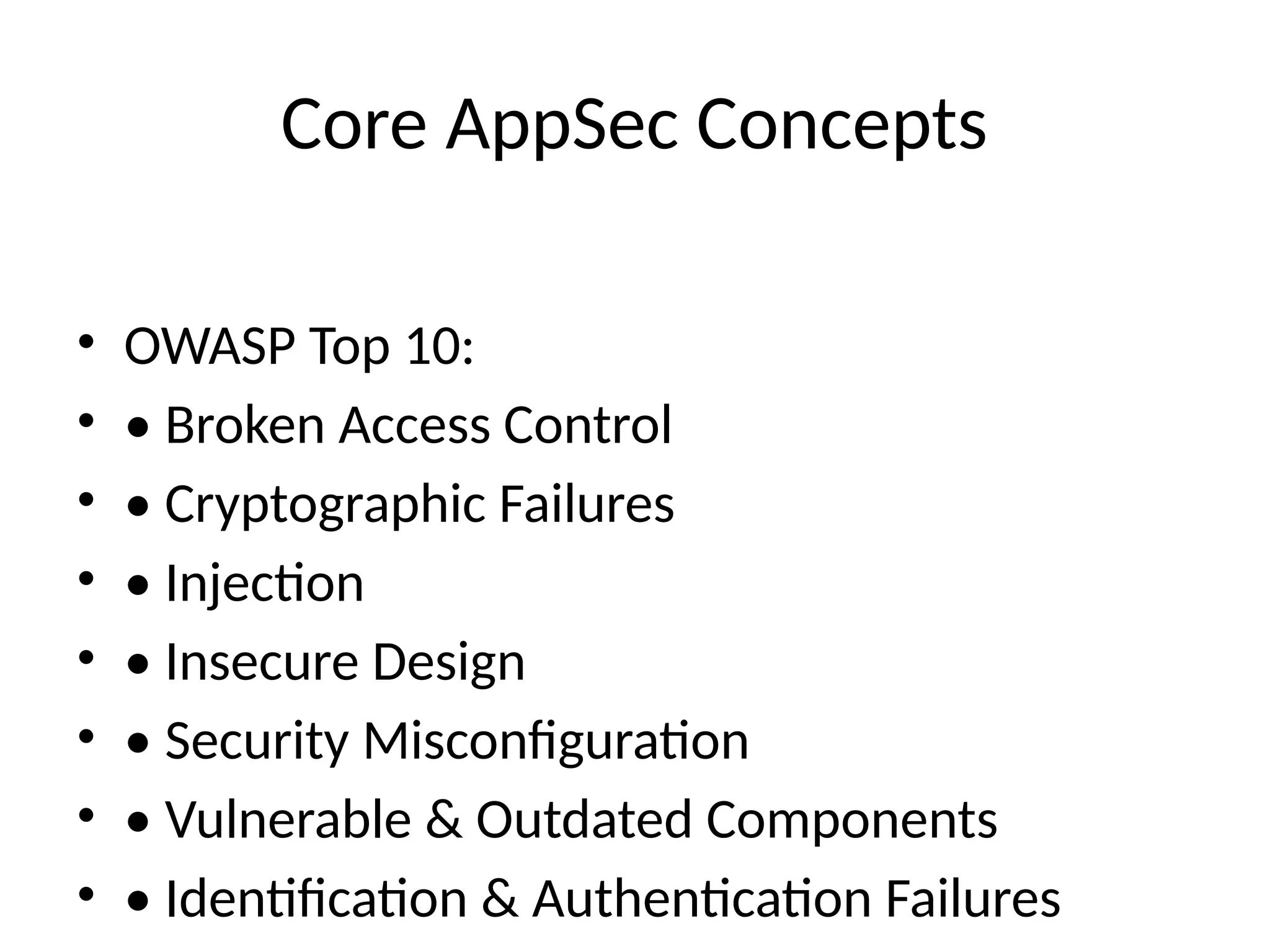 OWASP Top 10: • • Broken Access Control • • Cryptographic Failures • • Injection • • Insecure Design • • Security Misconfiguration • • Vulnerable & Outdated Components • • Identification & Authentication Failures
